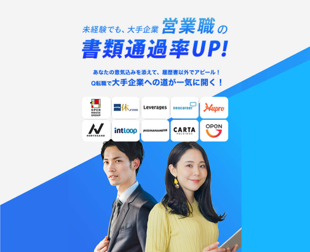 ミッション選考型転職サービスのQ転職では、共通ミッションを解くことで複数の企業に一括で応募することができます。 通常の書類選考よりも、共通ミッションと共にエントリーすることでアピールができ通過率UP! あなたのやる気やカルチャーマッチが測れるのでより解像度の高い書類選考が可能になります。 他の候補者に差をつける転職活動をQ転職で!